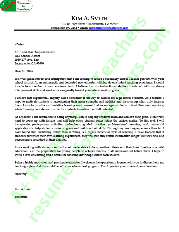Secondary Teacher Cover Letter Sample